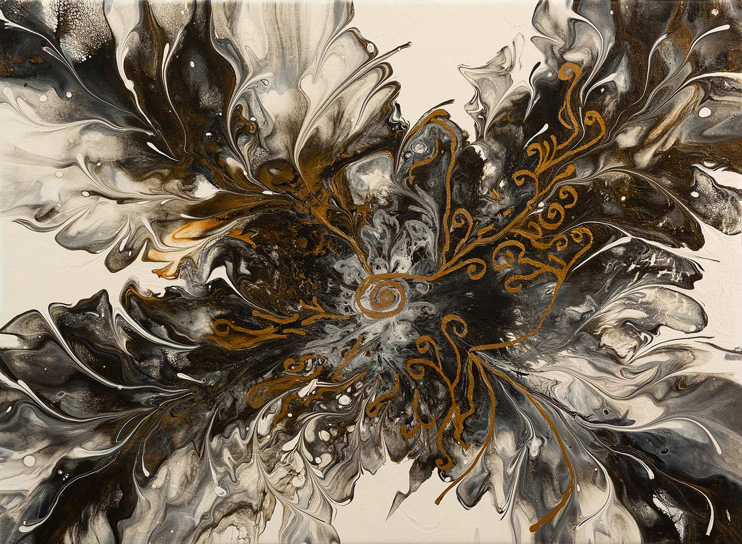 This abstract artwork titled “Brass Haze” features a dramatic interplay of dark and light tones, with swirling patterns that evoke a sense of movement and energy. The predominant colours are black, white, and various shades of grey, accentuated by striking brass or golden highlights that add depth and warmth to the composition. The intricate designs and textures suggest a sense of organic flow, reminiscent of swirling smoke or a dynamic abstract landscape. The brass elements are particularly eye-catching, adding a touch of elegance and contrast to the more muted background. This piece exudes a sense of mystery and sophistication, inviting viewers to explore its complex and captivating details.