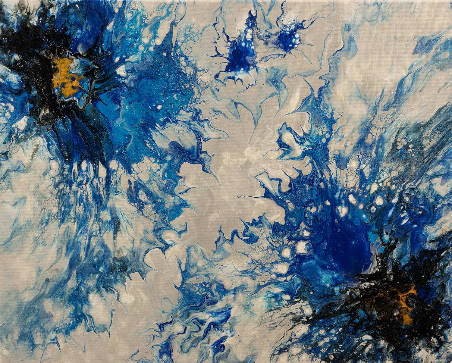 This abstract artwork, titled “Cobalt Blaze,” features a powerful and intense abstract composition dominated by shades of blue and white. The piece radiates energy and movement, with dynamic splashes and bursts of cobalt blue intermingling with white and black accents. The swirling patterns and intricate details evoke the sensation of a blazing fire or an explosive cosmic event, frozen in time. The deep blues and contrasting whites create a sense of depth and intensity, while the hints of black and gold add a touch of mystery and complexity. “Cobalt Blaze” captures the raw power and beauty of elemental forces, making it a striking and captivating addition to any art collection.