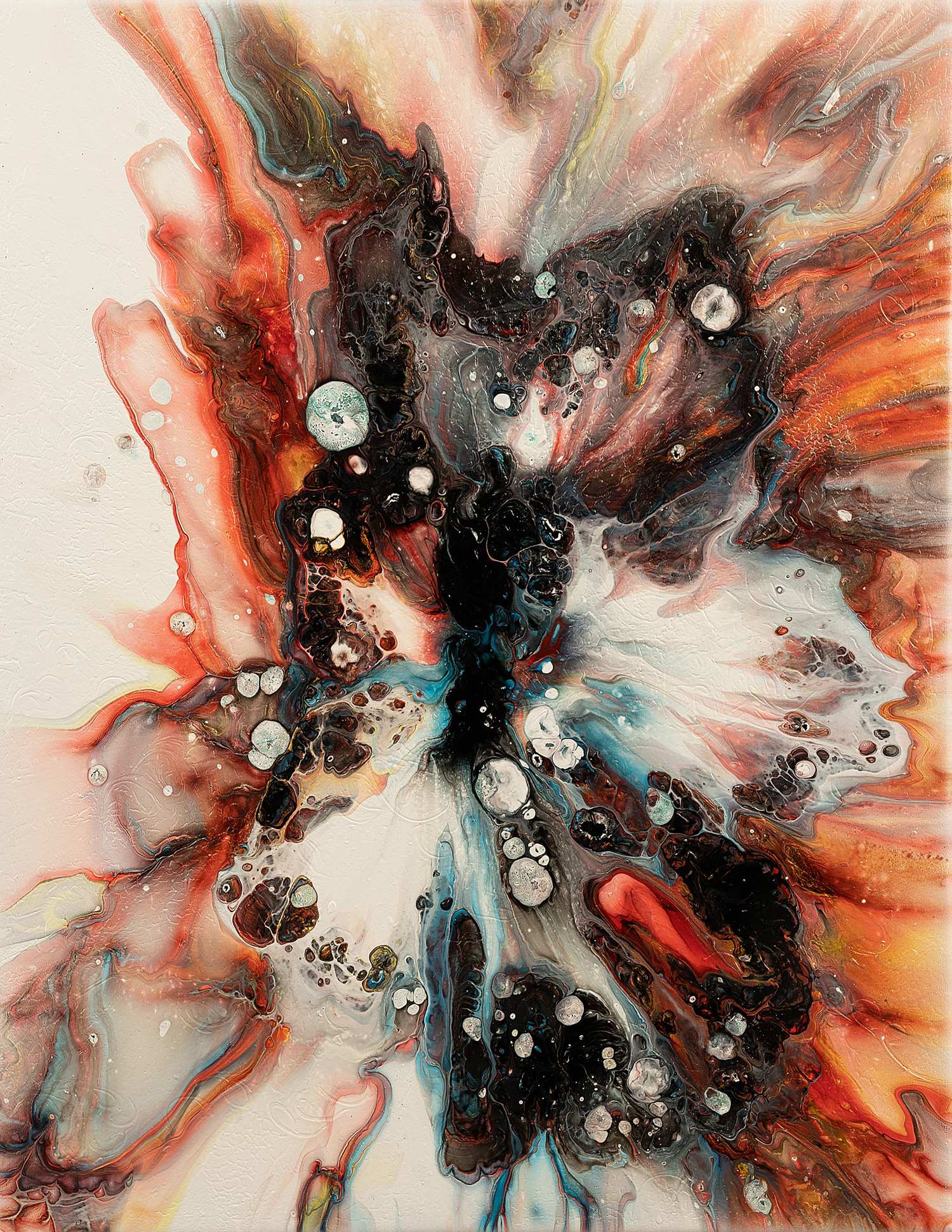 This abstract artwork, titled “Coral Mist,” features a dynamic and expressive abstract composition. The piece is characterised by vibrant coral and orange hues, which blend seamlessly with deep blacks and soft whites. Swirling patterns and bursts of colour radiate from a central focal point, creating a sense of explosive energy and movement. The textural elements and fluid brushstrokes add depth and complexity, inviting viewers to explore the intricate layers and details within the composition. The interplay of light and dark tones evokes a sense of both chaos and harmony, reminiscent of an underwater coral reef bathed in diffused light. “Coral Mist” captivates with its vibrant energy and intricate beauty, making it a striking addition to any art collection.
