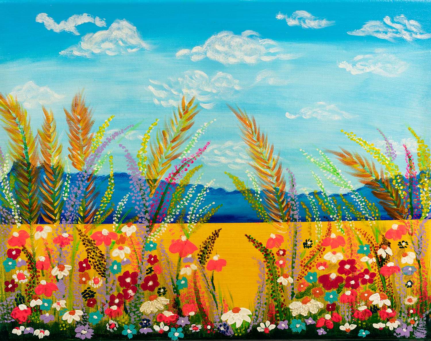This hand painting, titled “Forest on the Flowers,” features a vibrant and lively landscape filled with colourful wildflowers and tall grasses under a bright blue sky with fluffy white clouds. The foreground bursts with an array of red, white, purple, and yellow flowers, creating a rich tapestry of colours and textures. Tall, golden wheat stalks rise above the floral field, swaying gently against a distant backdrop of blue mountains. This piece captures the joyous essence of nature in full bloom, making it a cheerful and uplifting addition to any space.