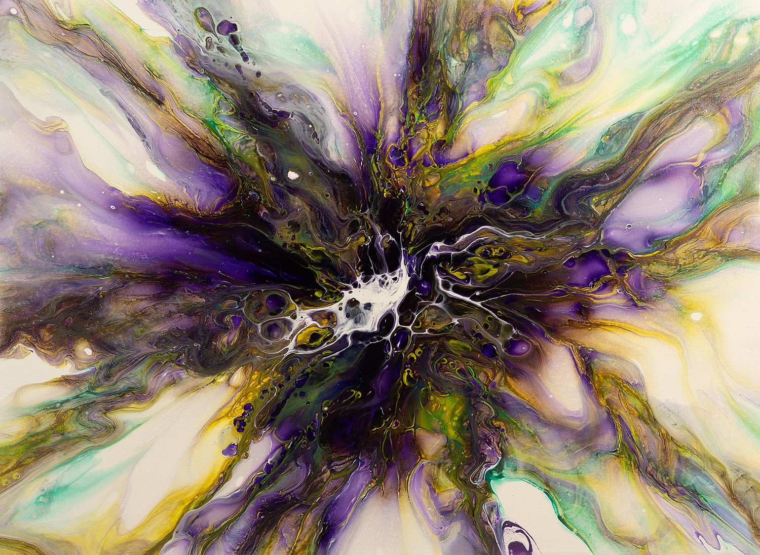 This abstract artwork, titled “Indigo Wave,” features a striking and dynamic abstract composition that exudes a sense of energy and depth. The piece is dominated by rich purples and deep indigos, interlaced with vibrant greens and warm yellows. The swirling patterns and fluid brushstrokes radiate from a central point, creating a powerful sense of movement and flow. The intricate textures and bold contrasts evoke the sensation of waves crashing and merging, capturing the viewer’s attention with its vibrant energy. “Indigo Wave” invites viewers to explore the complexities and beauty of its colour palette and design, making it a captivating and dramatic addition to any art collection.
