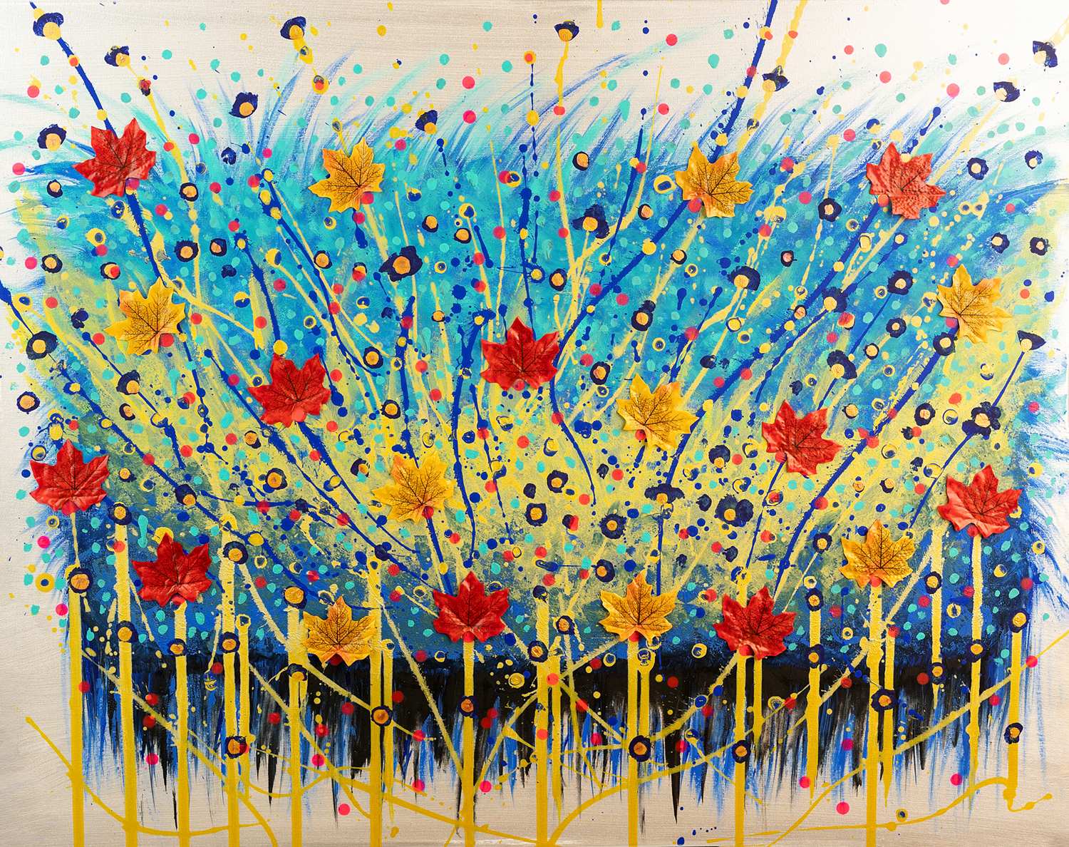 This artwork, titled “Life Leaves,” is a vibrant and dynamic piece that celebrates the beauty and energy of nature. The composition features a lively background of swirling blue and yellow tones, creating a sense of movement and vitality. Scattered throughout the painting are bright red and yellow leaves, each intricately detailed and textured, adding a three-dimensional quality to the piece. The use of splashes and dots of various colours adds an element of spontaneity and joy, making this artwork a captivating and uplifting addition to any space.