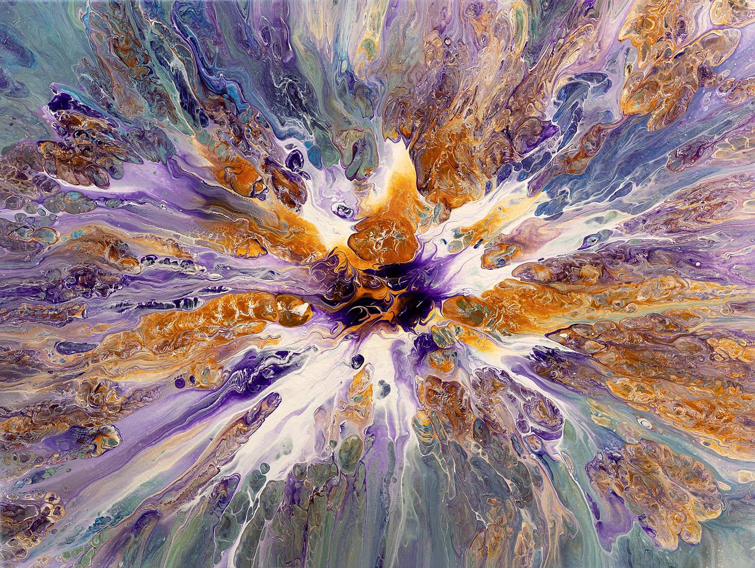 This abstract artwork, titled “Lilac Horizon,” presents a vibrant and energetic abstract composition that bursts with colour and movement. The piece is dominated by shades of purple and lilac, interwoven with warm oranges, golds, and touches of white. The swirling patterns and dynamic brushstrokes radiate from the centre, creating a sense of explosive energy and expansion. The intricate details and fluid transitions between colours evoke a feeling of looking out over a fantastical horizon where the sky meets the earth in a brilliant display of light and colour. “Lilac Horizon” captures the viewer’s imagination with its vivid and harmonious palette, making it a striking and uplifting addition to any art collection.