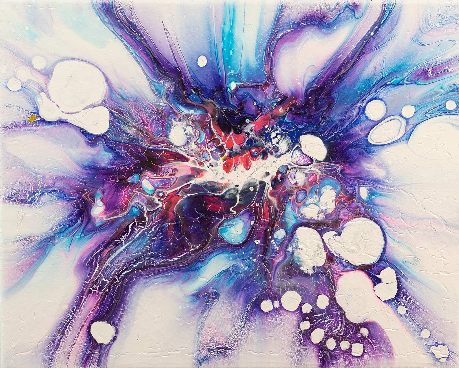 This abstract artwork, titled “Mauve Dream,” captures a vibrant and ethereal abstract scene dominated by soft purples, pinks, and blues. The composition radiates from a central point, with dynamic swirls and splashes of colour creating a sense of explosive energy and movement. White accents and textural elements add depth and contrast, enhancing the fluidity and dreamlike quality of the piece. The interplay of light and dark hues creates a captivating visual effect, reminiscent of a cosmic nebula or a blossoming flower. “Mauve Dream” invites viewers to immerse themselves in its serene yet dynamic beauty, making it a striking and enchanting addition to any art collection.