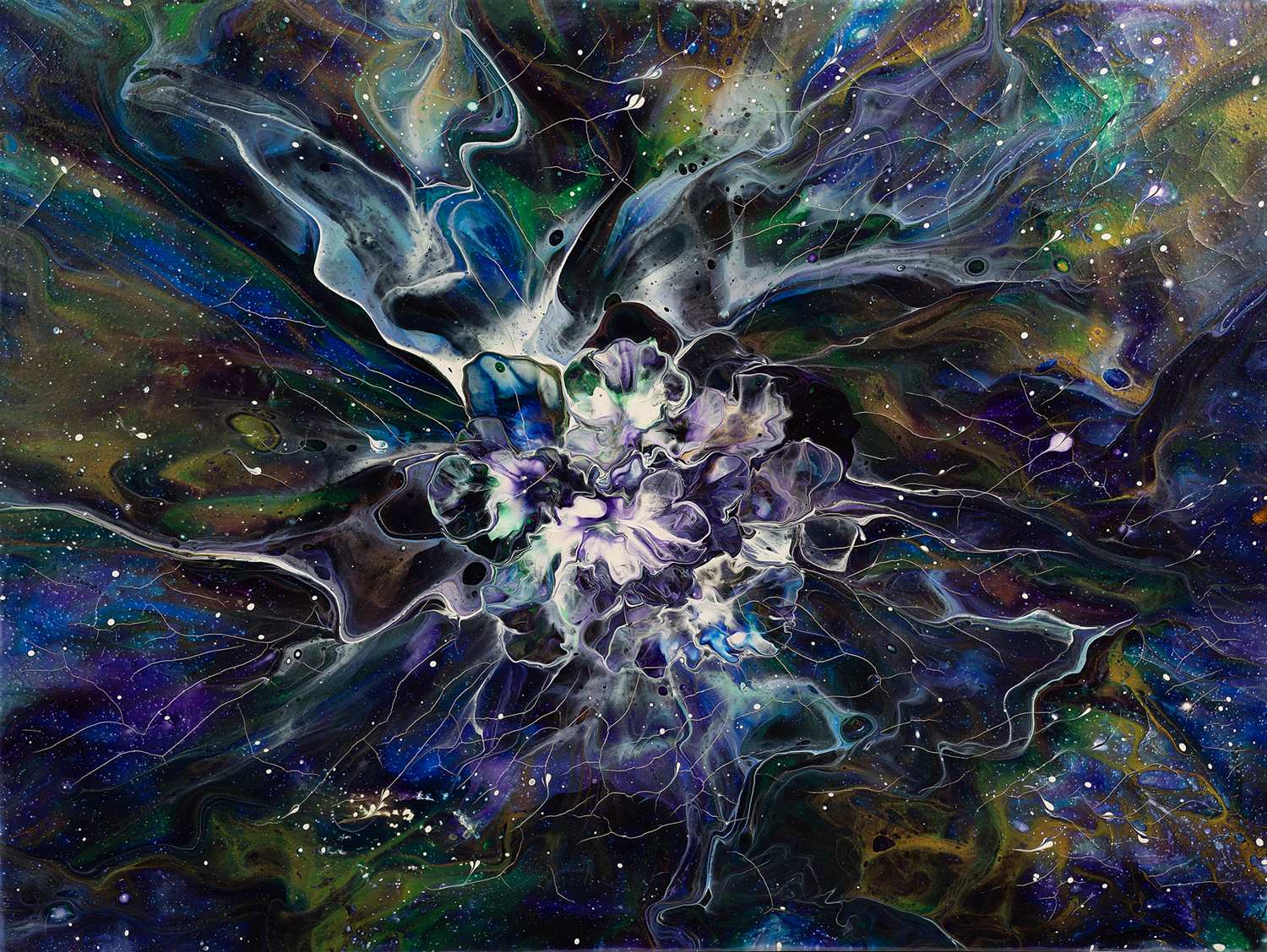 This abstract artwork, titled “Midnight Glow,” is an enchanting abstract piece that captures the essence of a luminous night sky. The composition is a rich tapestry of deep blues, purples, and greens, interwoven with radiant whites and subtle hints of gold. At the centre, a burst of light emanates, surrounded by swirling patterns that evoke the celestial dance of stars and nebulae. The intricate details and fluid brushstrokes create a sense of cosmic movement and energy, as if capturing a moment of stellar creation. The interplay of light and dark, combined with the vibrant colour palette, invites viewers to immerse themselves in the mysteries of the universe. “Midnight Glow” is a captivating and evocative piece that adds a touch of celestial beauty to any art collection.