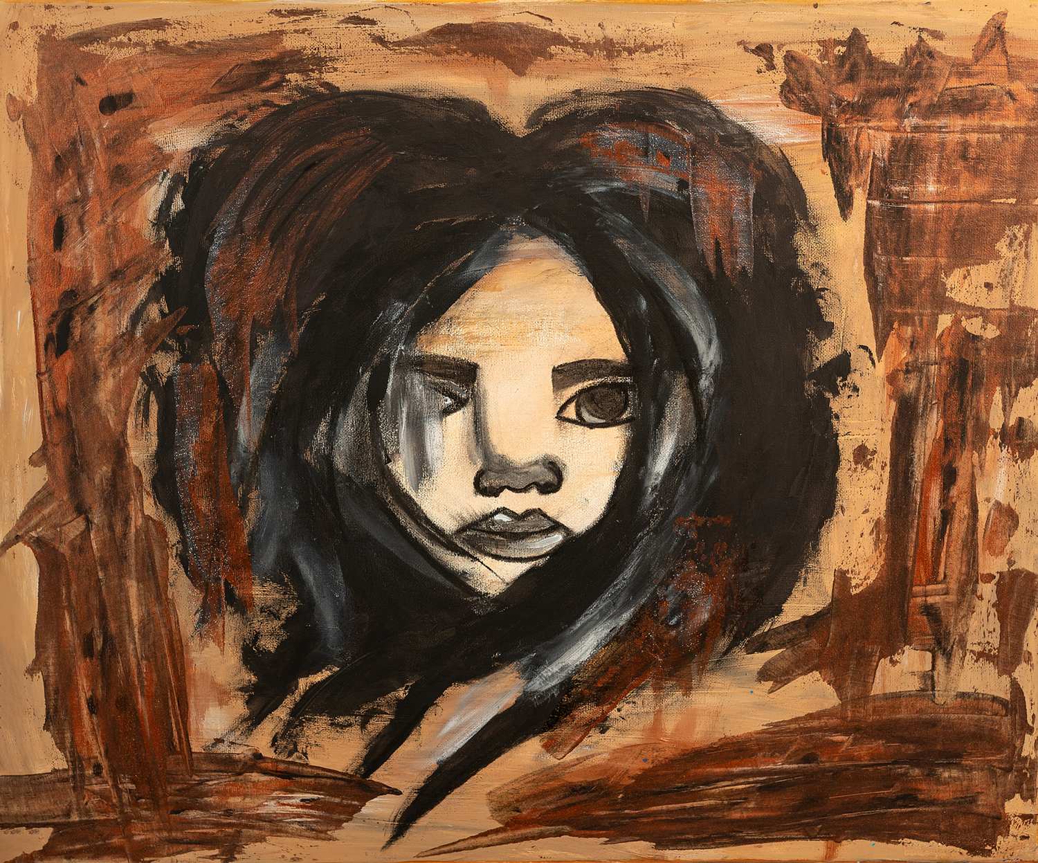 This hand painting, titled “Mystery Girl,” presents an evocative portrait of a young woman rendered in a moody, expressionistic style. The composition features bold, dark brushstrokes that frame the girl’s face, creating a stark contrast with the earthy, textured background. The girl’s intense gaze and the interplay of shadows add depth and emotion to the piece, evoking a sense of intrigue and contemplation. The raw, almost unfinished edges contribute to the overall mysterious and haunting atmosphere, making this a compelling and thought-provoking addition to any art collection.