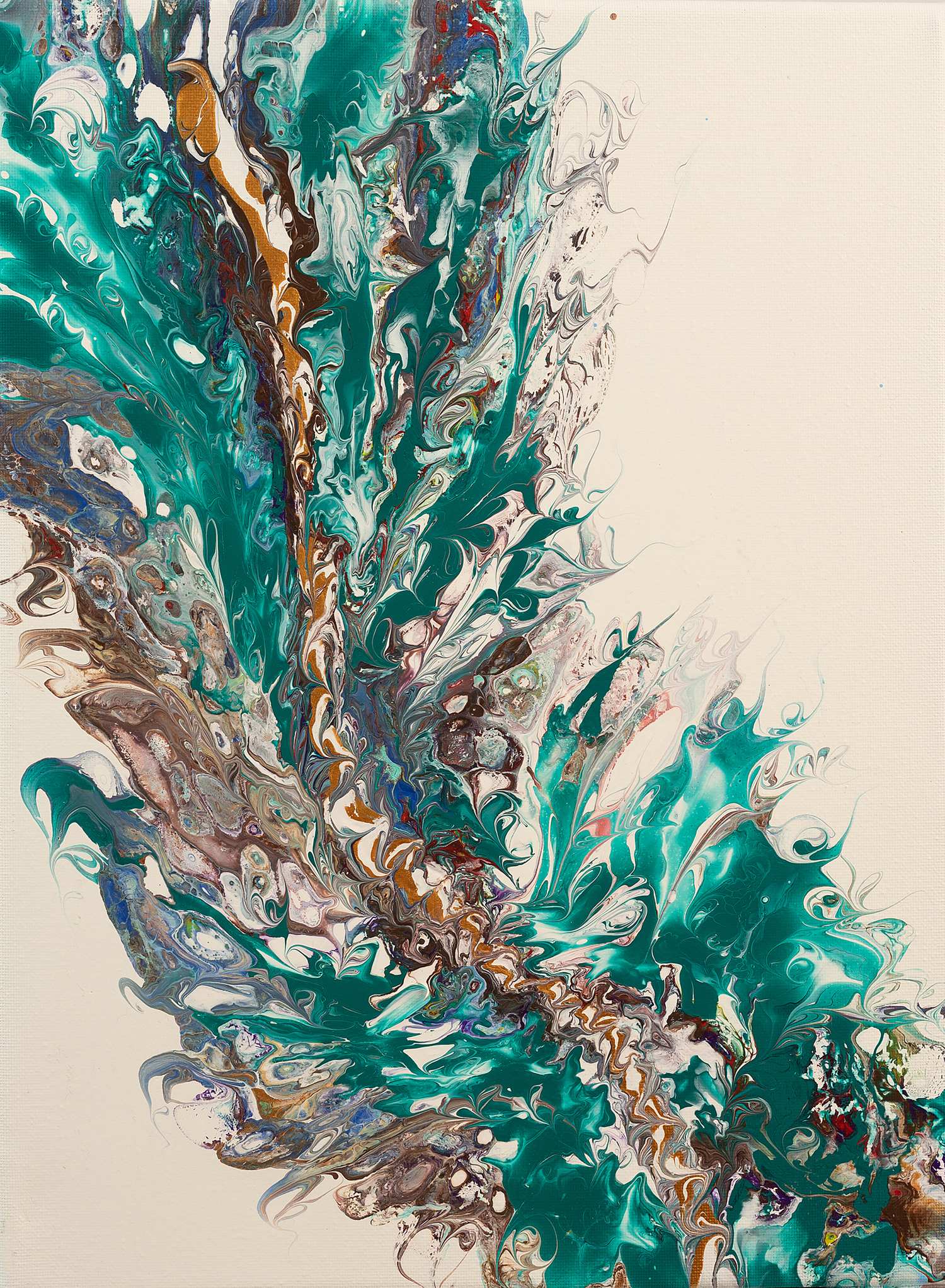This abstract artwork, titled “Mystic Flow,” features an abstract composition that conveys a sense of dynamic energy and fluidity. The piece is dominated by rich teal and earthy tones, intricately swirling together with hints of white, blue, and brown. The marbled patterns create a sense of depth and movement, evoking the feeling of natural forces at play, such as water currents or wind. This captivating piece invites viewers to explore its intricate details and flowing forms, making it a stunning and engaging addition to any art collection.