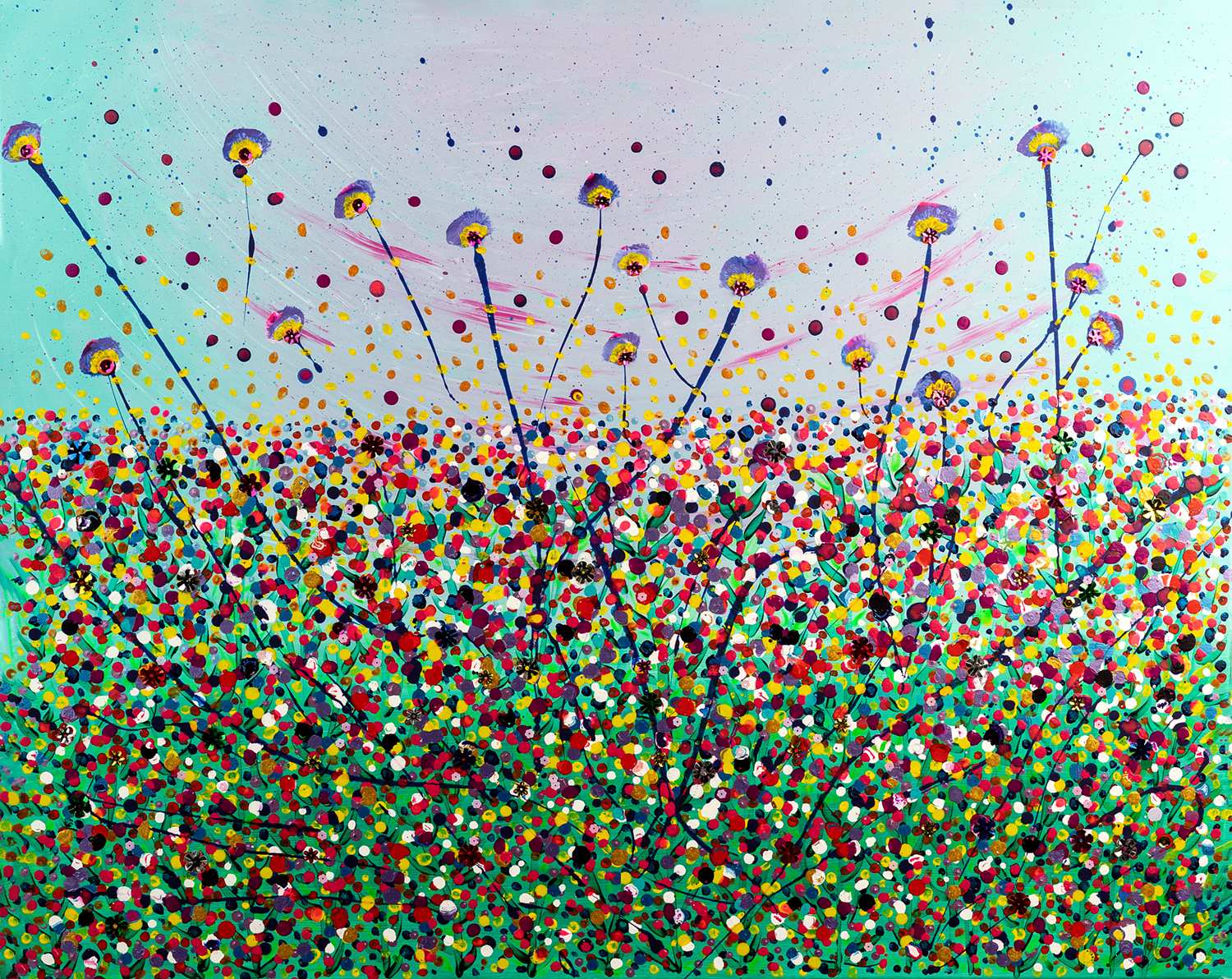 This hand painting, titled “The Sea of Summer,” is a vibrant and colourful depiction of a summer meadow in full bloom. The canvas is filled with an array of bright, dot-like flowers in shades of red, yellow, pink, and green, creating a dense, lively field. Tall, slender stems with purple flowers rise above the sea of blooms, reaching towards the soft pastel sky. The artist’s use of dots and dashes gives the piece a dynamic, almost pointillist feel, capturing the joyful essence of a sunlit summer day.