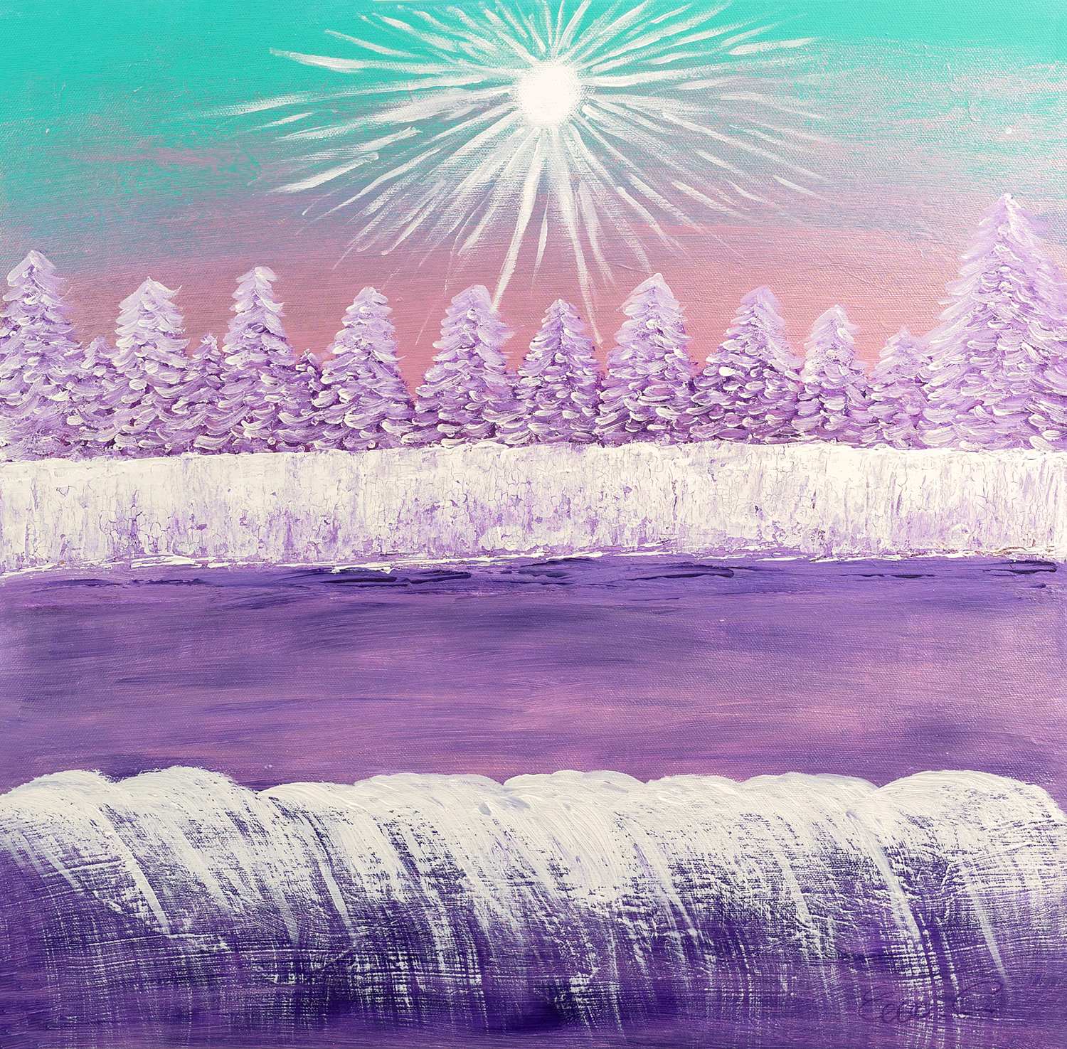 This hand painting, titled “Winter Fall,” beautifully captures the serene and tranquil essence of a winter landscape. The composition features a cascading waterfall painted in soft shades of white and lavender, set against a backdrop of snow-covered trees and a gradient sky transitioning from turquoise to pink. The radiance of the sun, depicted with bright white rays, adds a touch of warmth to the cool, pastel scene. This piece evokes a sense of calm and stillness, making it a perfect addition to any space seeking to embrace the quiet beauty of winter.